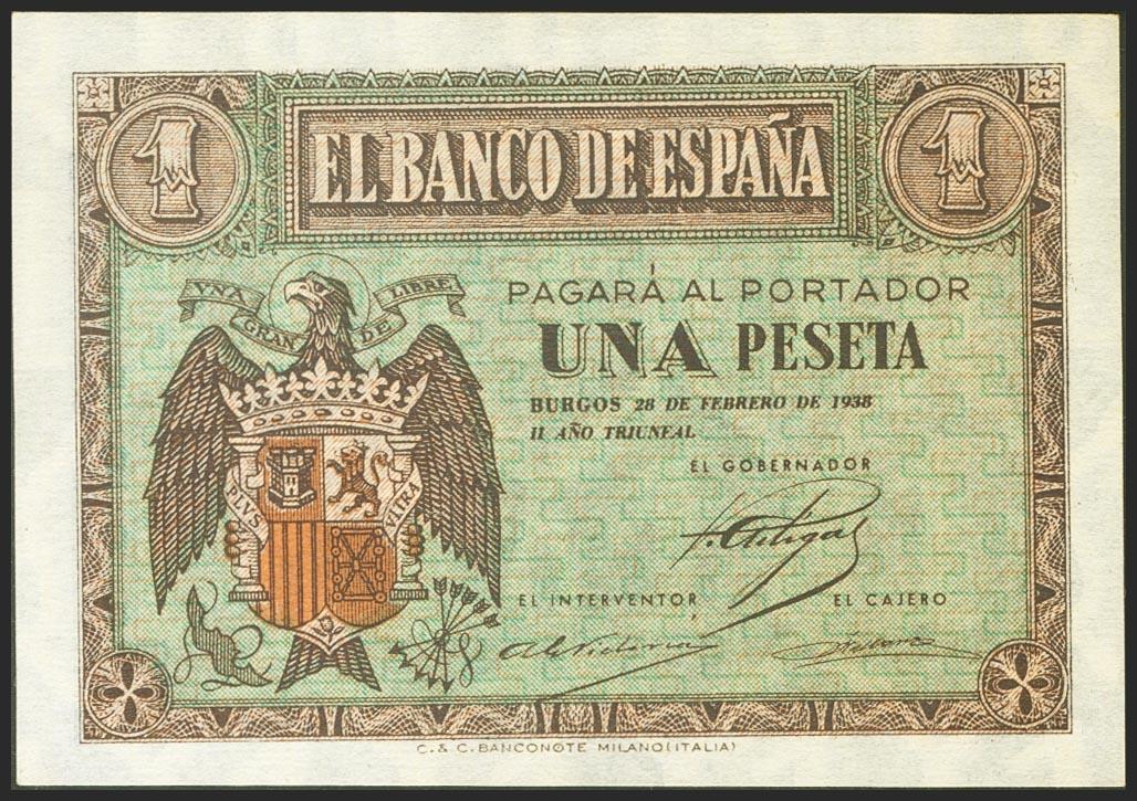 1 Pesetas. February 28, 1938. Series A. (Edifil 2021: 427, Pick: 107a). Unusual in this quality, original sizing. Uncirculated.
