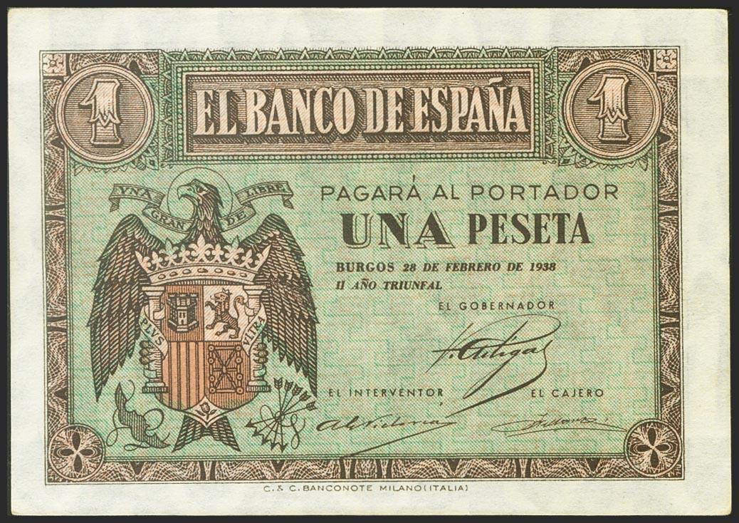 1 Peseta. February 28, 1938. Series F. (Edifil 2021: 427a). It retains much of its original sizing. Good Extremely Fine.