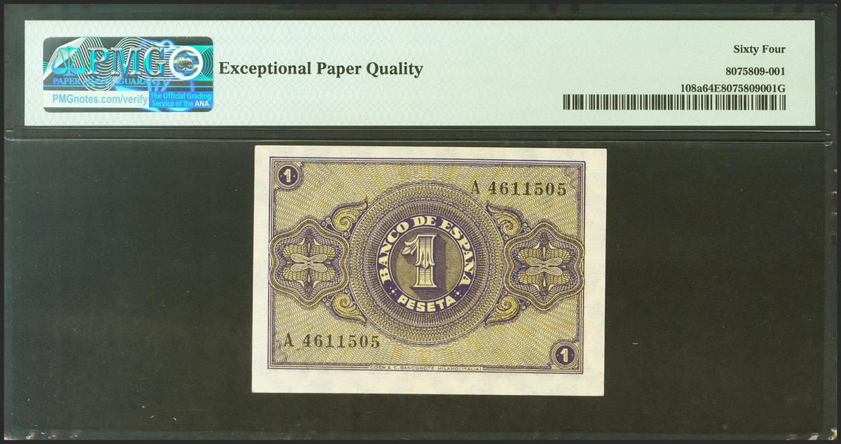 1 Pesetas. April 30, 1938. Series A. (Edifil 2021: 428, Pick: 108a). Original sizing. Uncirculated. PMG64EPQ package.