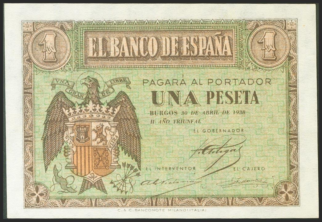 1 Peseta. April 30, 1938. Series M. (Edifil 2021: 428a). Original sizing. Uncirculated.