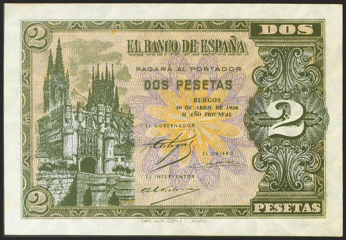 2 Peseta. April 30, 1938. Series C. (Edifil 2021: 429a). Original sizing. Good Extremely Fine.