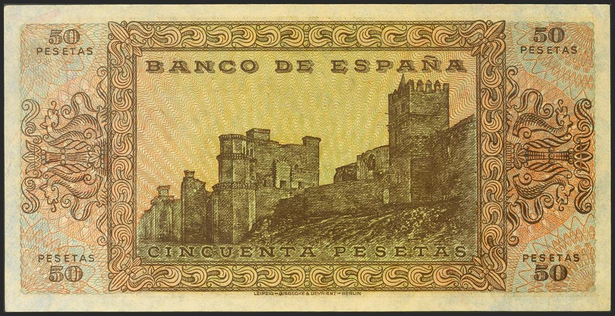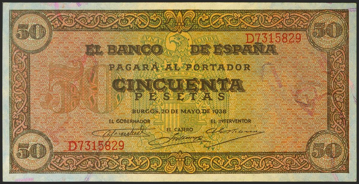 English 50 pesetas. May 20, 1938. Series D. (Edifil 2021: 431a, Pick: 112a). Rare in this quality, it retains all its original sizing. Uncirculated.