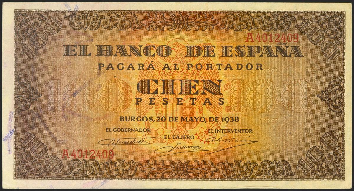 100 pesetas. May 20, 1938. Series A. (Edifil 2021: 432, Pick: 113). Unusual in this quality, it retains all its original sizing. Uncirculated.