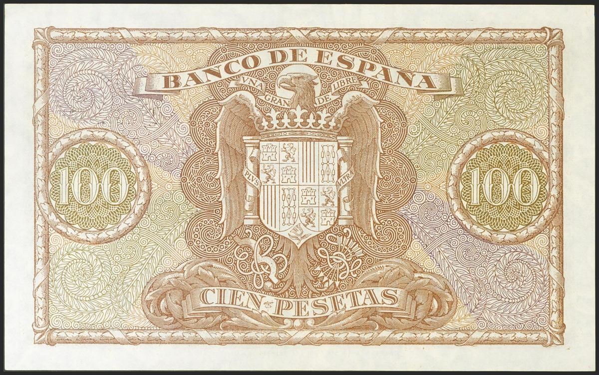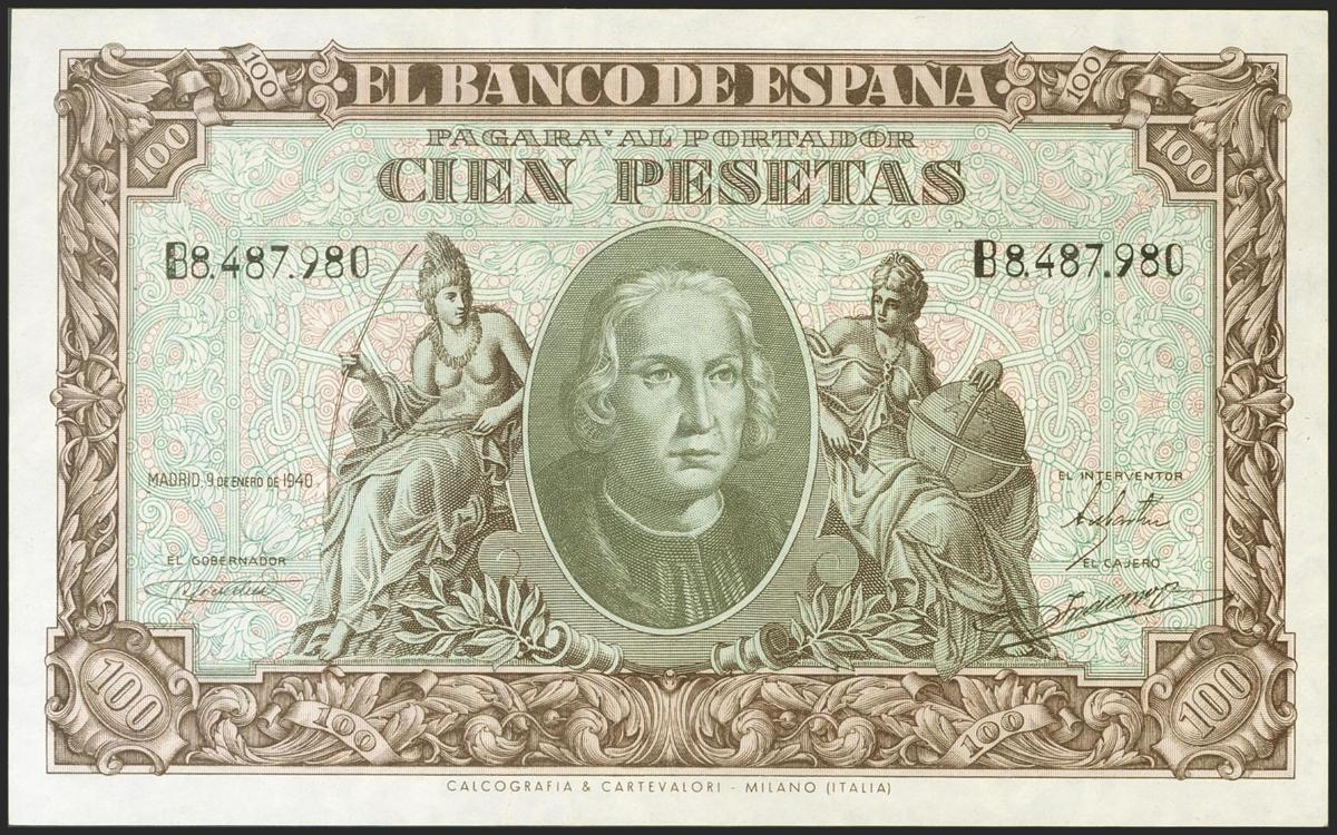 100 pesetas. January 9, 1940. Series B. (Edifil 2021: 438a, Pick: 118a). Rare in this quality, it retains all its original sizing. Uncirculated.