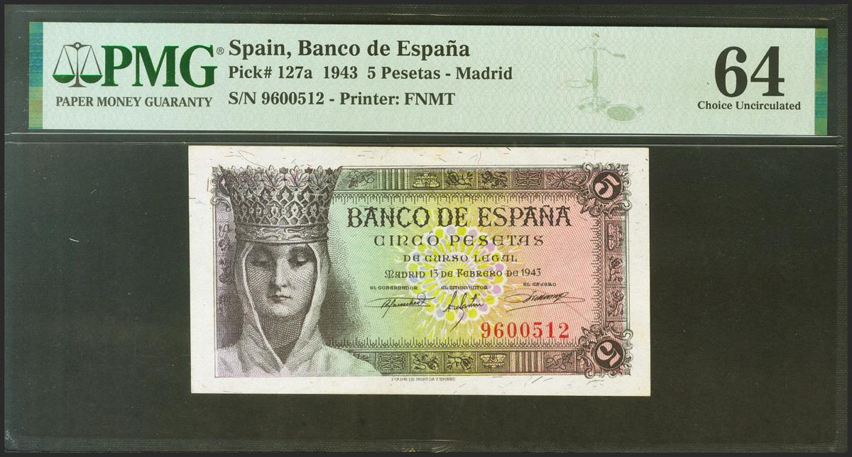5 pesetas. February 13, 1943. No series. (Edifil 2021: 446, Pick: 127a). Unusual in this quality. Uncirculated. PMG64 package.