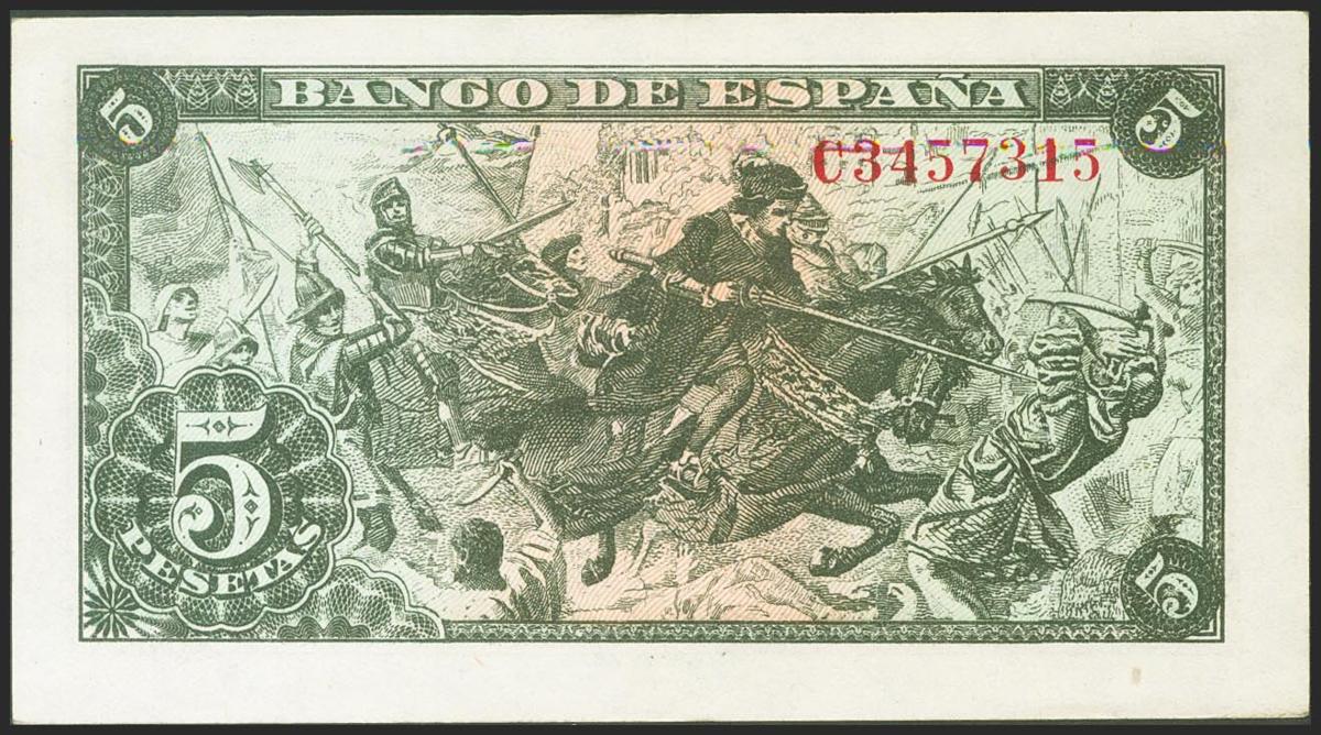 5 pesetas. June 15, 1945. Series C. (Edifil 2021: 449a). Original sizing. Good Extremely Fine.
