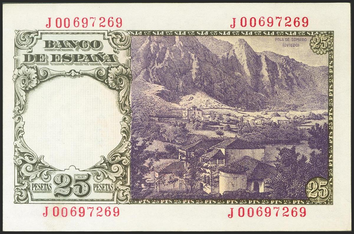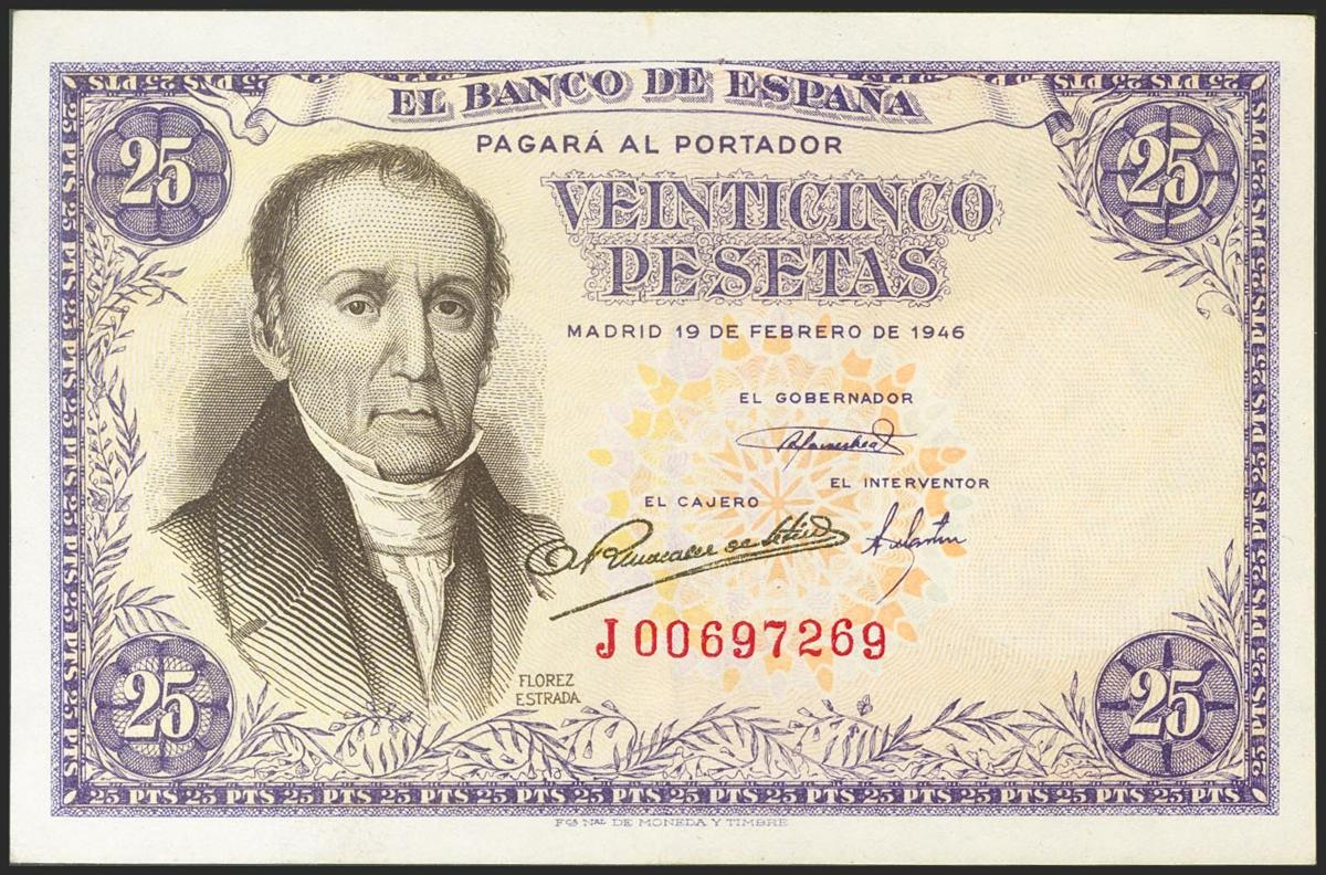 25 pesetas. February 19, 1946. Series J. (Edifil 2021: 450a). It retains much of its original sizing. Good Extremely Fine.
