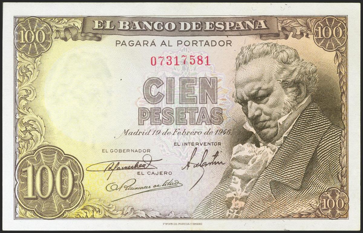 100 pesetas. February 19, 1946. No series. (Edifil 2021: 451). It retains much of its original sizing. Extremely Fine.
