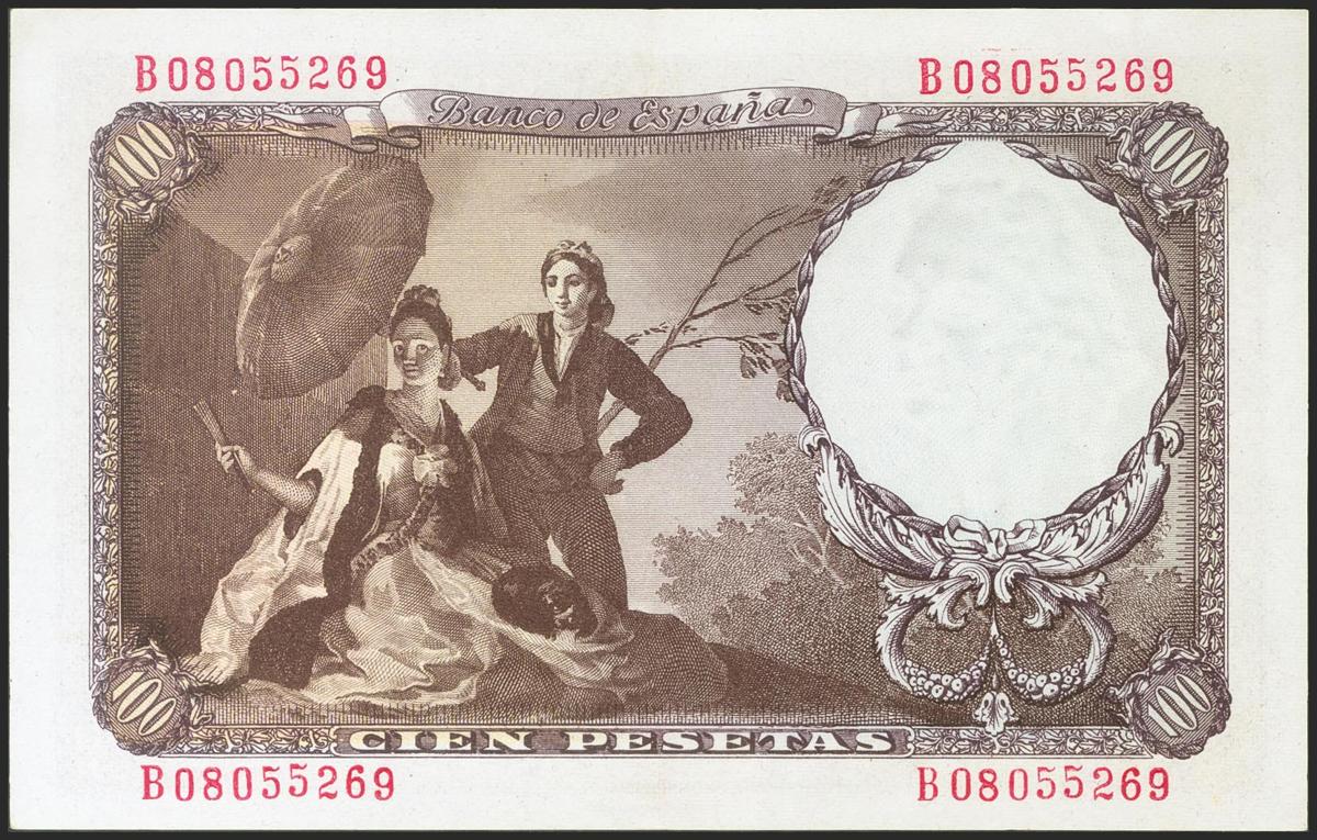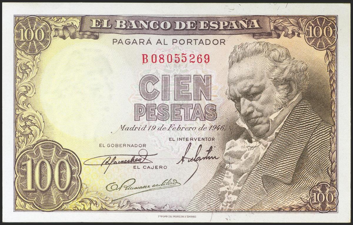100 pesetas. February 19, 1946. Series B. (Edifil 2021: 451b). It retains part of its original sizing. Good Extremely Fine.