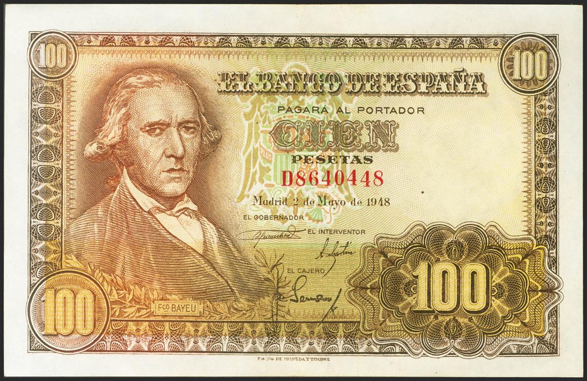 100 pesetas. May 2, 1948. Series D. (Edifil 2021: 456a). Retains part of the original sizing. Good Extremely Fine.