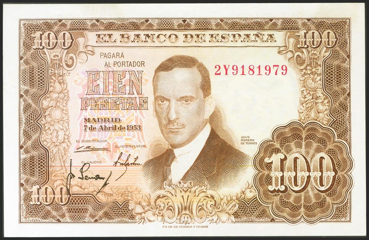 100 pesetas. April 7, 1953. Series 2Y and with the signature variety traced on the back. (Edifil 2021: 464c). Unusual, retaining part of its original sizing. Extremely Fine.