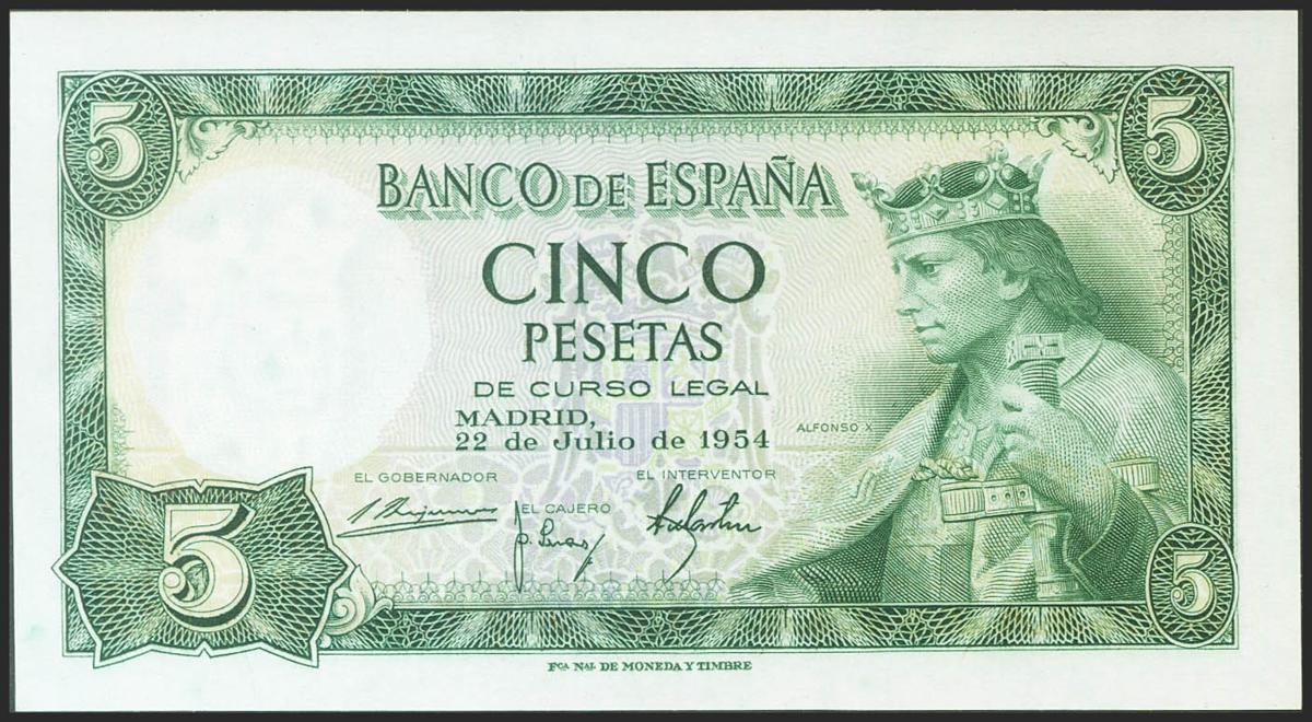 English 5 pesetas. July 22, 1954. No series. (Edifil 2021: 466). Original sizing. Uncirculated.