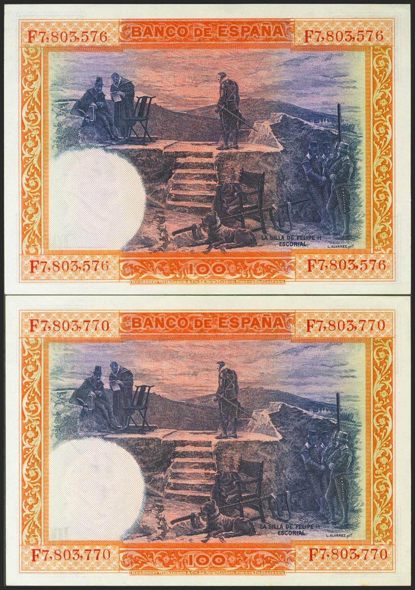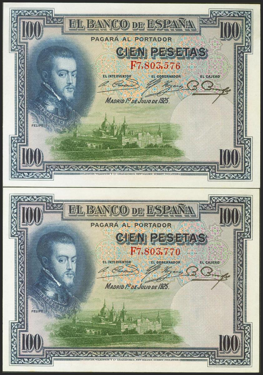 Set of 2 100 Pesetas bills issued on July 1, 1925 with series F (Edifil 2021: 350), keeping all its original finish. Uncirculated.