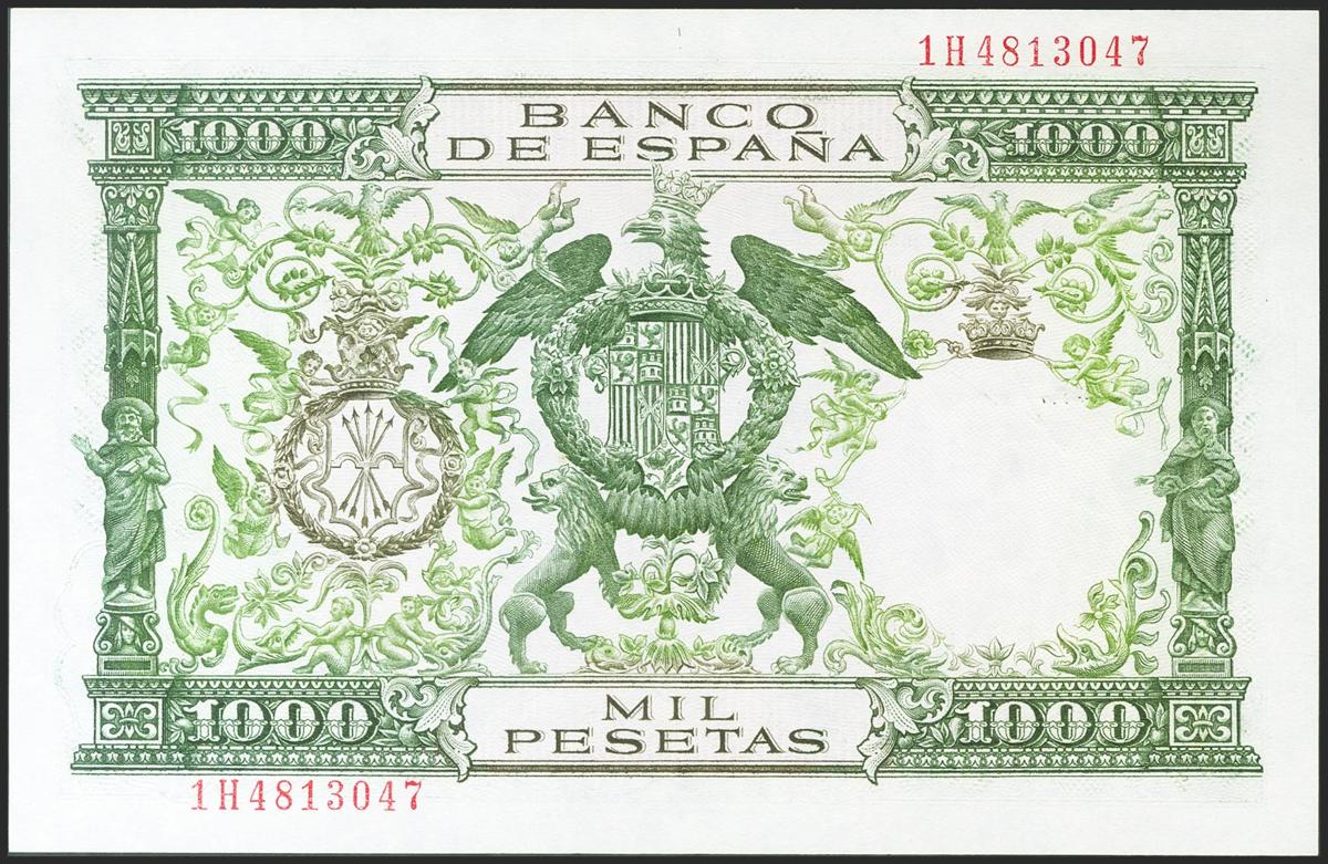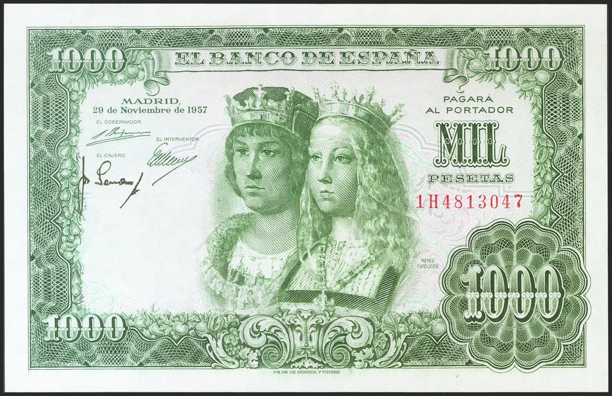 1000 Pesetas. November 29, 1957. Series 1H. (Edifil 2021: 469b). Unusual in this superlative quality, it retains all its original sizing. Uncirculated.