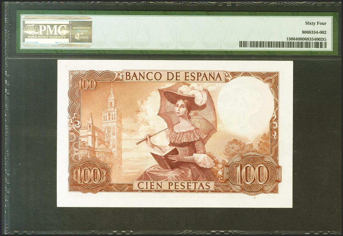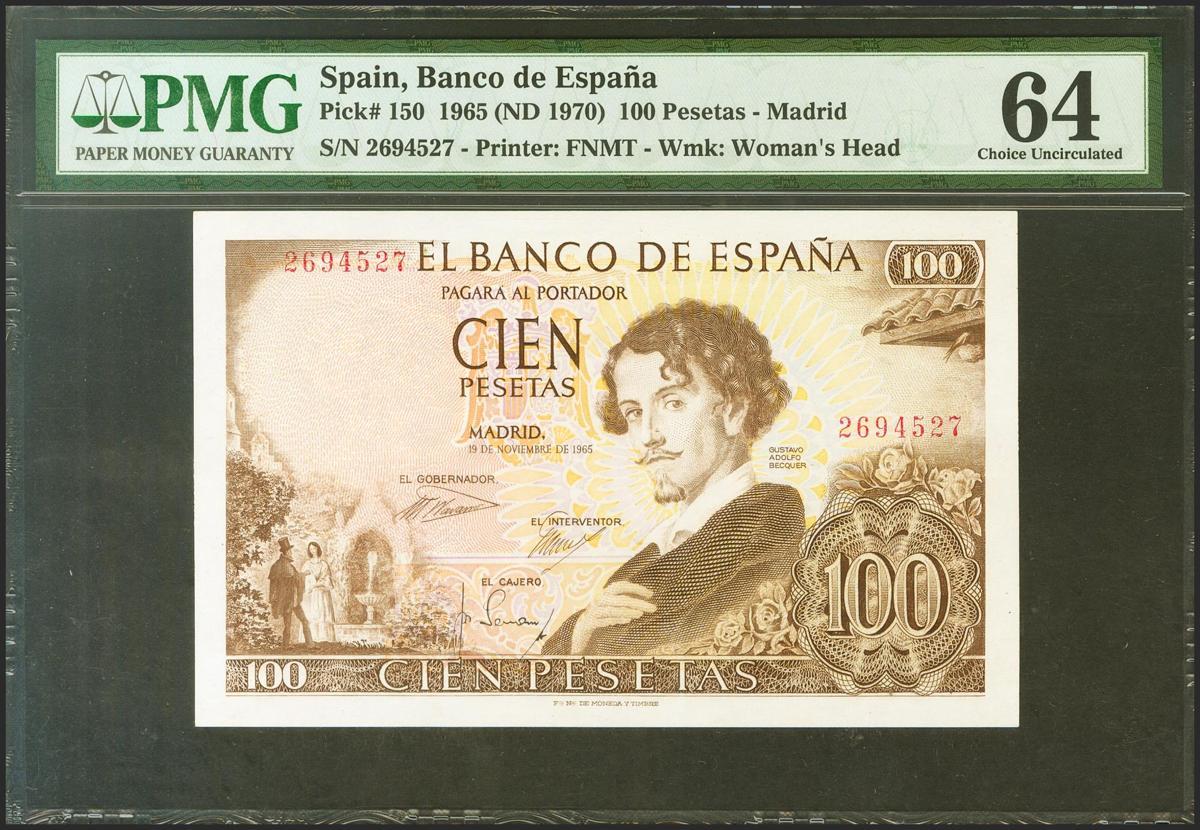 100 pesetas. November 19, 1965. No series. (Edifil 2021: 470, Pick: 150). PMG64 package.