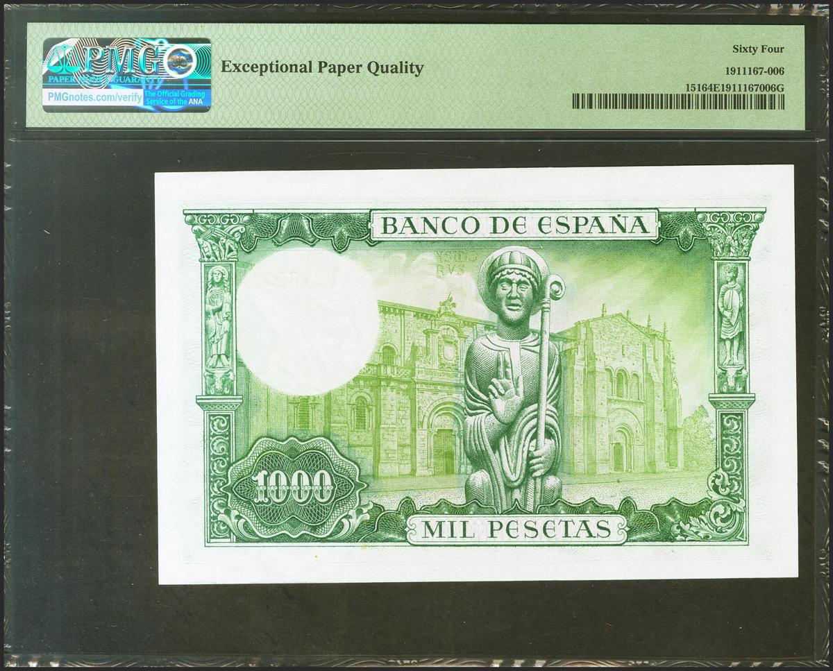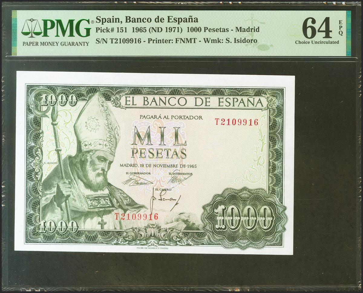 1000 Pesetas. November 19, 1965. Series T. (Edifil 2021: 471b, Pick: 151). Original sizing. Uncirculated. PMG64EPQ package.