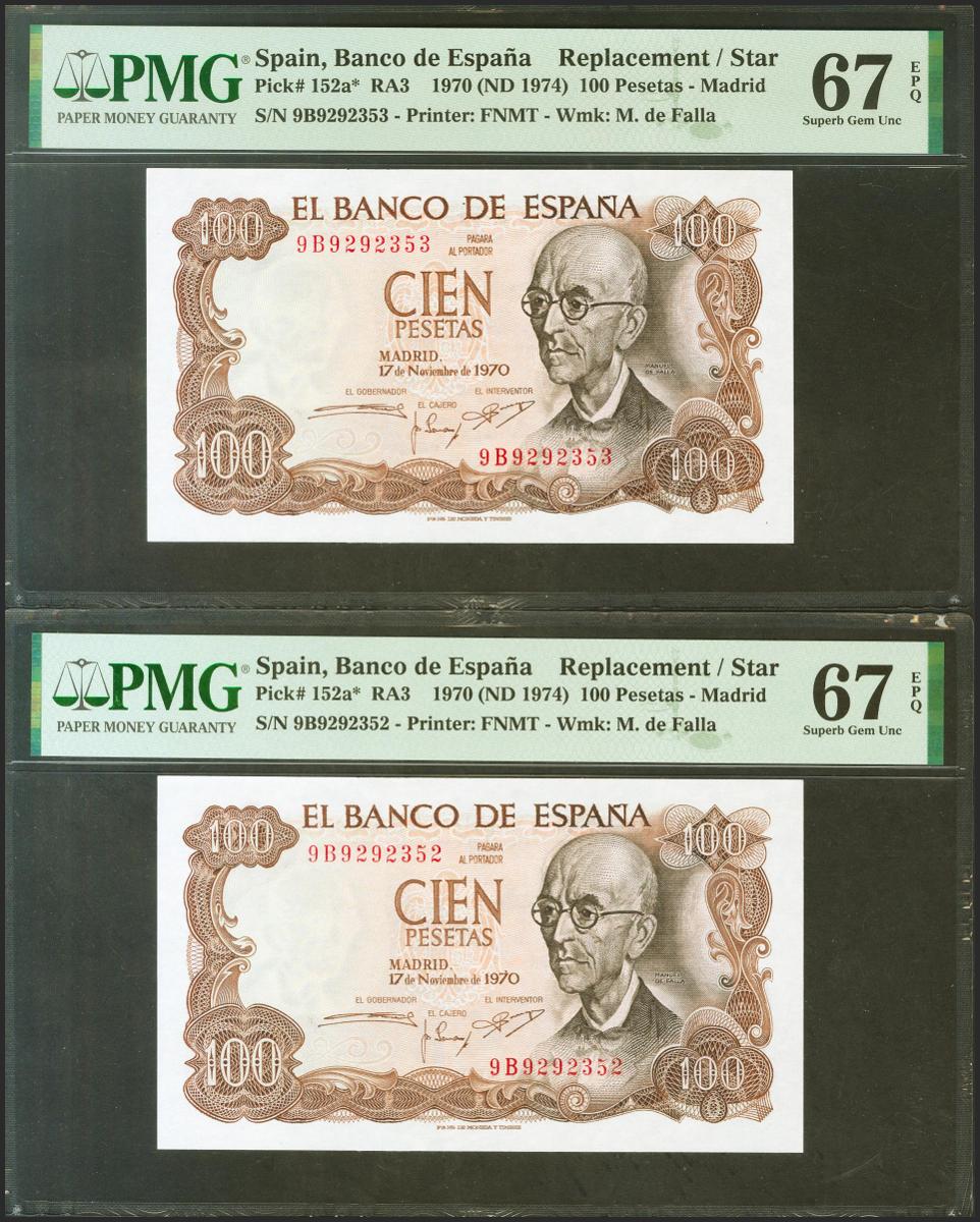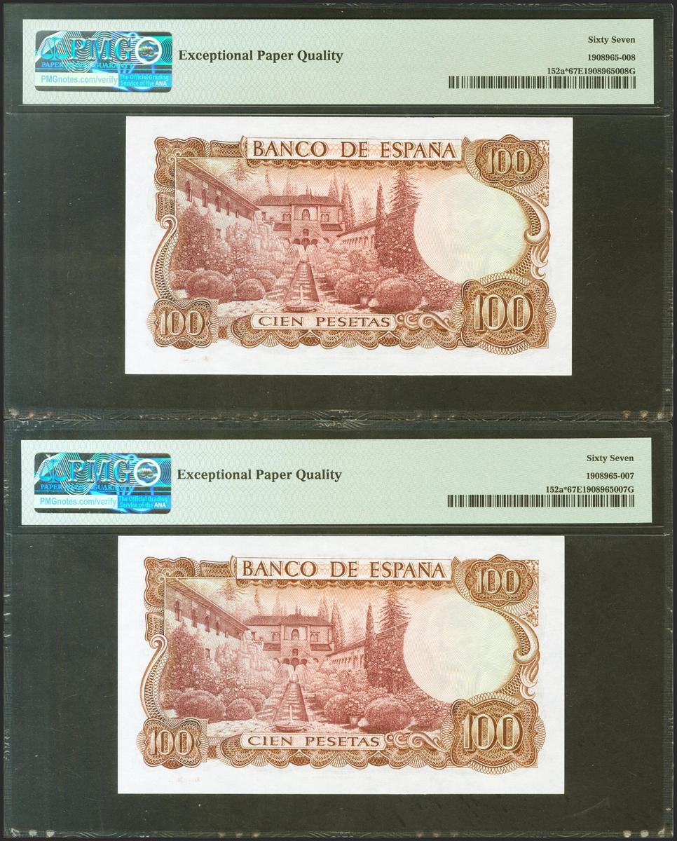 100 pesetas. November 17, 1970. Correlative couple. Special series 9B. (Edifil 2021: 472d, Pick: 152a*). Very rare in this quality, original sizing. Uncirculated. PMG67EPQ package, both.