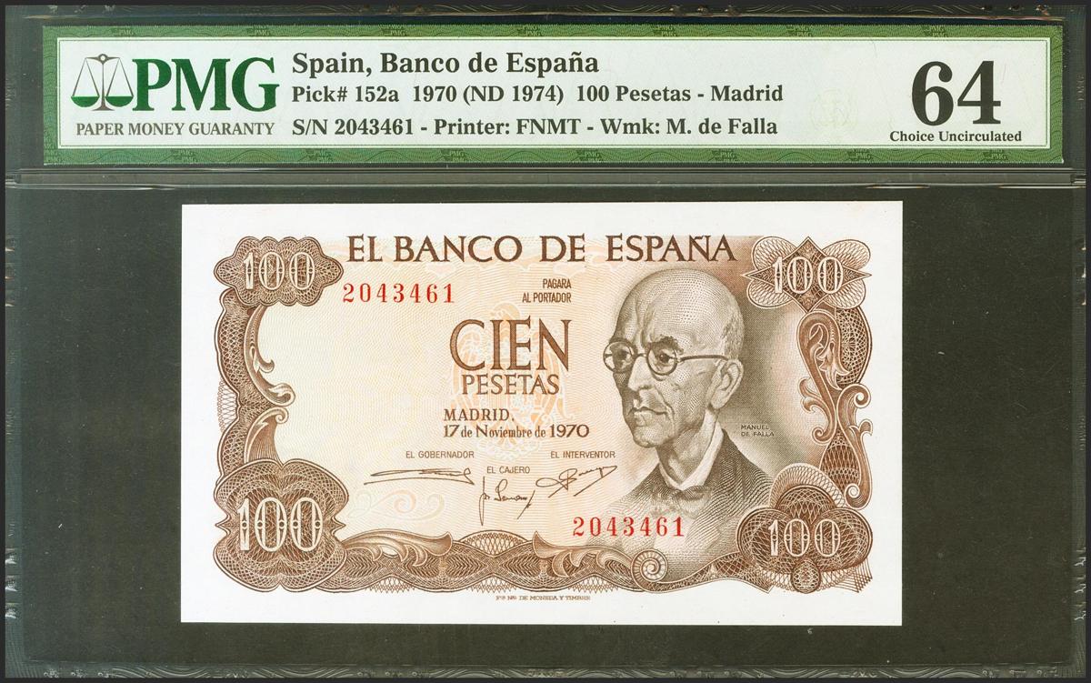 100 pesetas. November 17, 1970. No series. (Edifil 2021: 472, Pick: 152a). Uncirculated. PMG64 package.