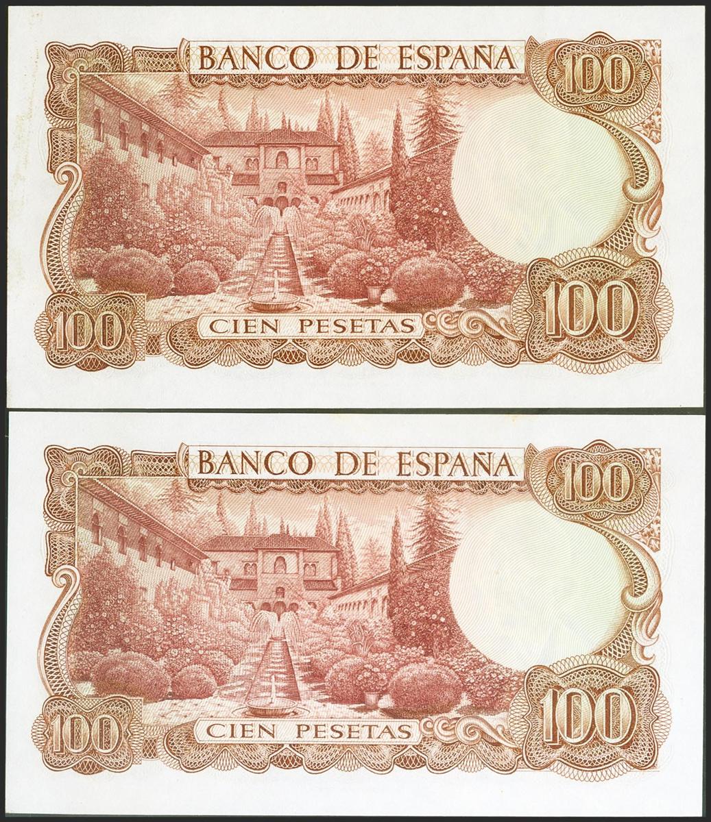100 pesetas. November 17, 1970. Correlative couple. No serie. (Edifil 2021: 472). Almost Uncirculated.