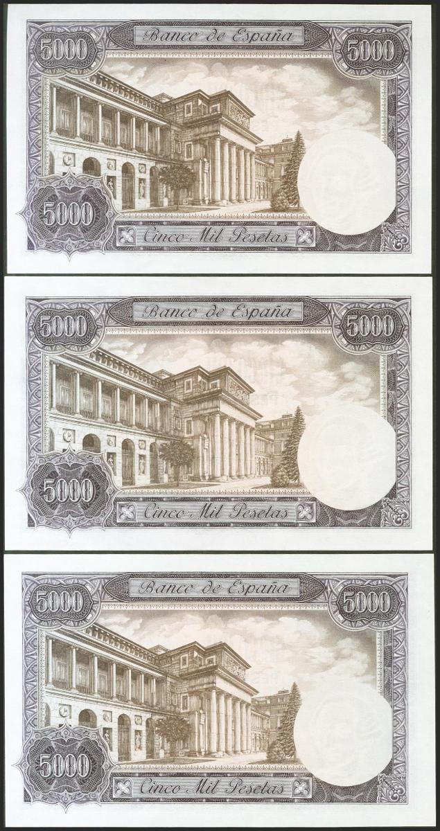 Set of 3 5000 Pesetas bills, issued on February 6, 1976, all of them without series. (Edifil 2021: 475). Uncirculated/EBC++.