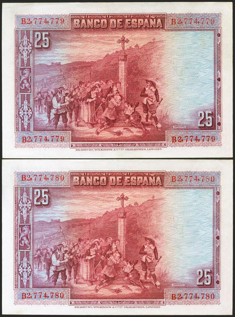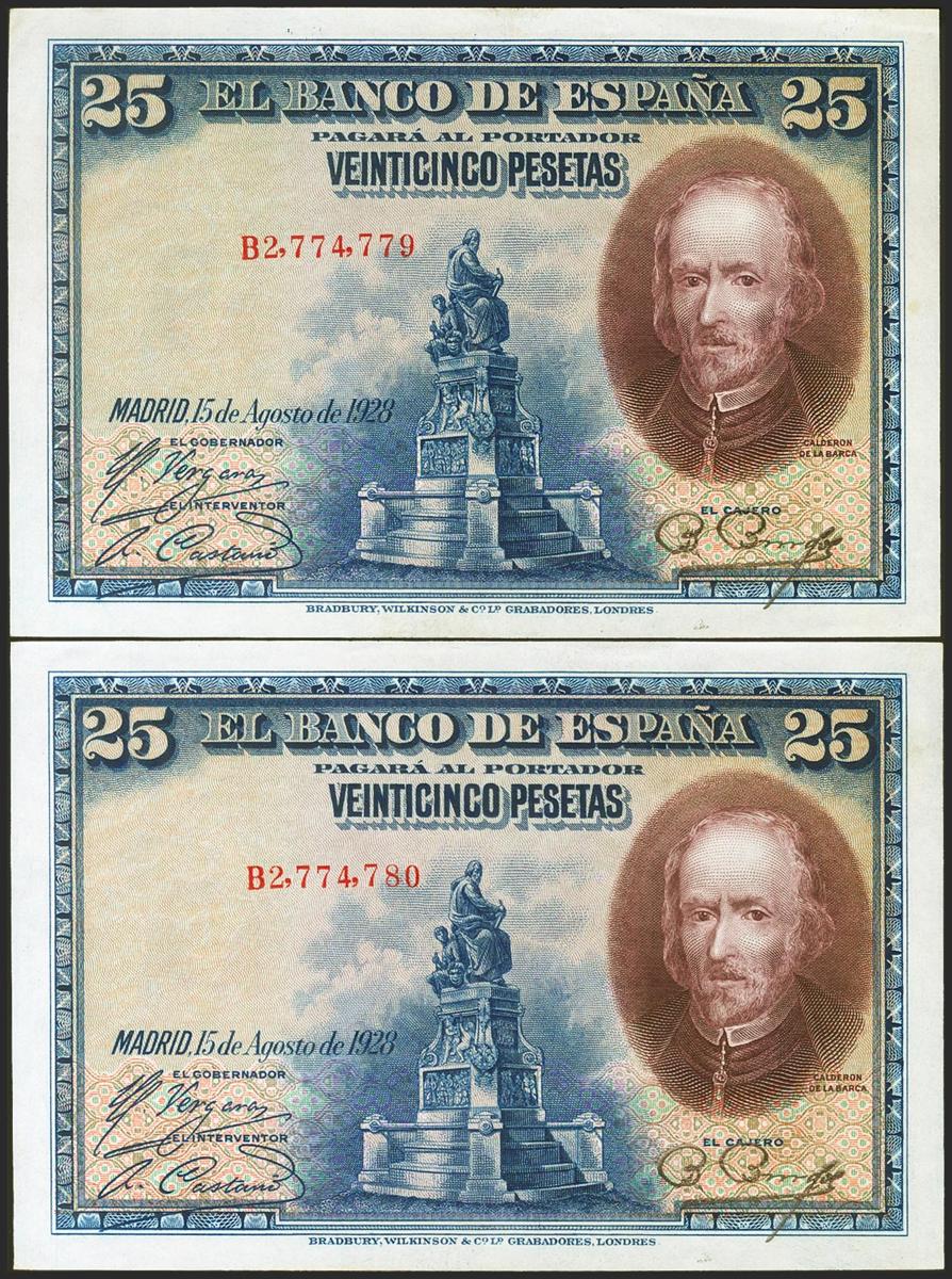 25 pesetas. August 15, 1928. Correlative couple. Series B. (Edifil 2021: 353). Original sizing. Almost Uncirculated.