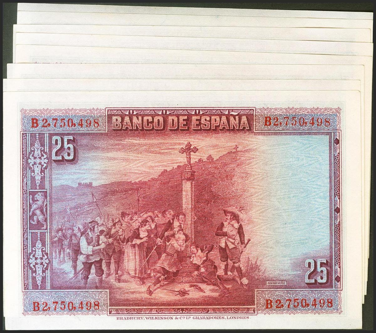 Beautiful set of 8 correlative 25 Pesetas bills issued on August 15, 1928 with series B (Edifil 2021: 353), keeping all its original sizing. Uncirculated/ Almost Uncirculated.