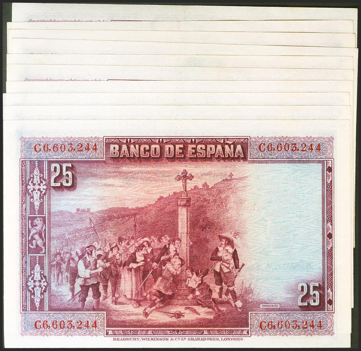 Beautiful set of 10 correlative 25 Pesetas bills issued on August 15, 1928 with series C (Edifil 2021: 353), keeping all its original sizing. Uncirculated/ Almost Uncirculated.