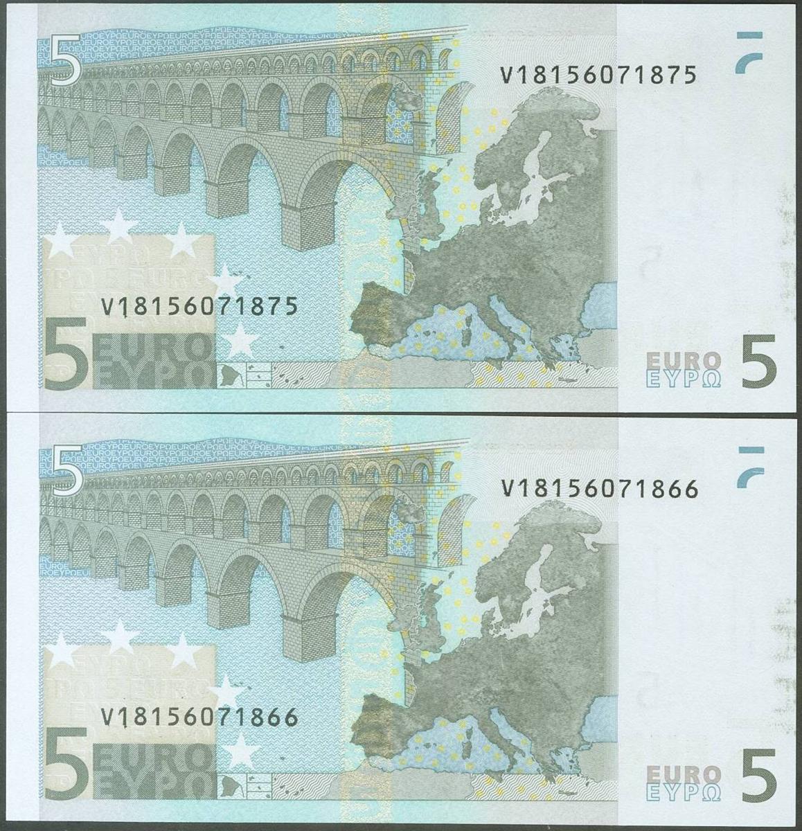 5 euros. January 1, 2002. Correlative couple. Signature Trichet. Series V (Spain) (it should be remembered that the last digit of the numbering of all the banknotes denominated in euros is for internal control of the European Central Bank, the one that marks the correlativity of the banknotes is the penultimate digit). (Edifil 2021: 486A). Uncirculated.