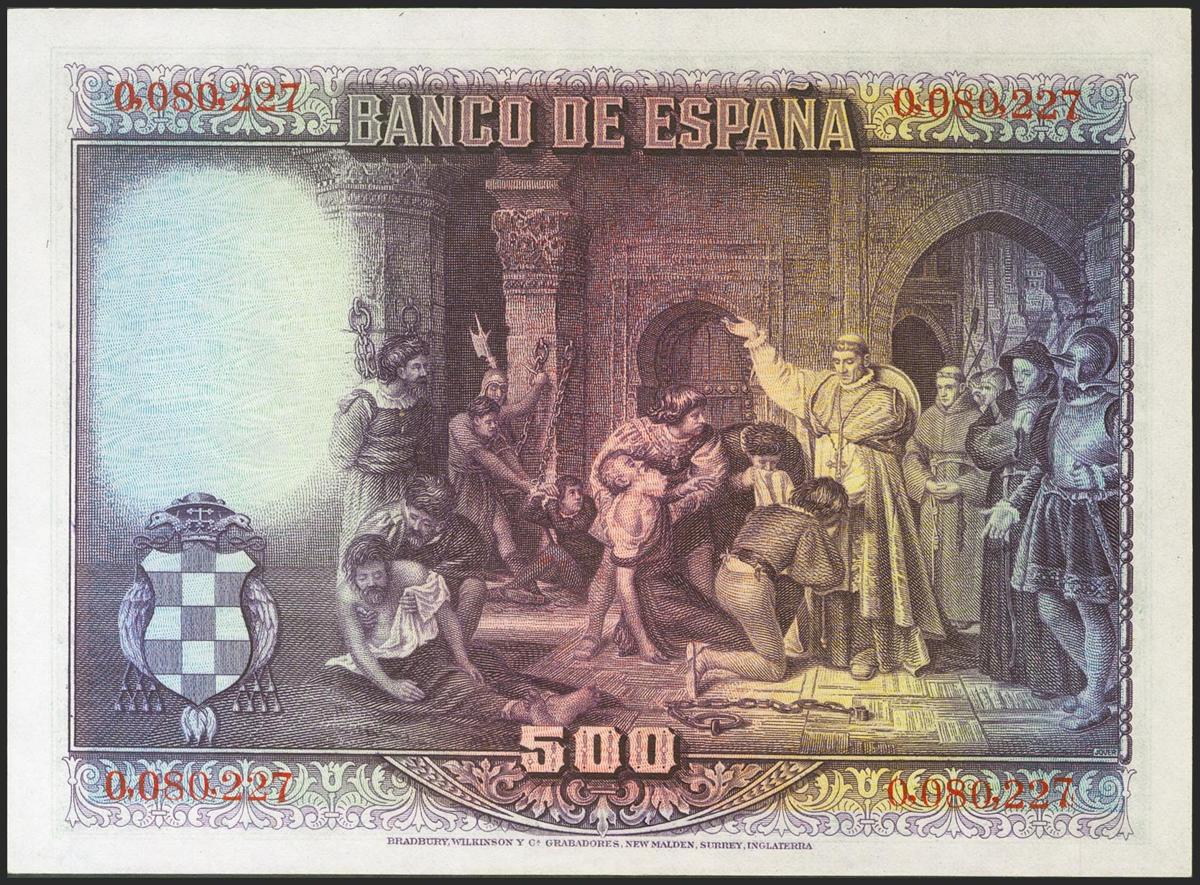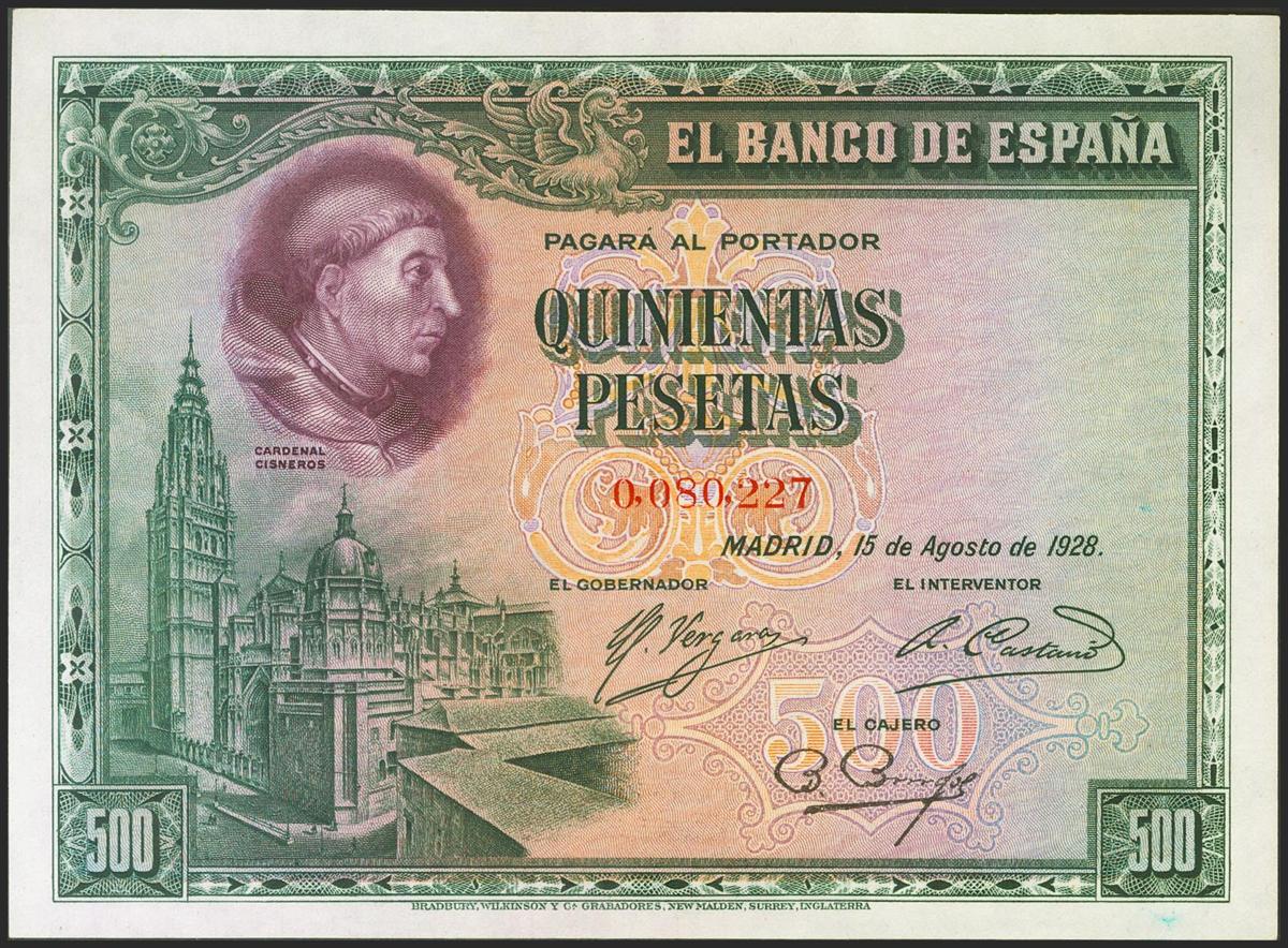 500 pesetas. August 15, 1928. Without series and with low numbering. (Edifil 2021: 356, Pick: 77a). It retains much of its original sizing. Good Extremely Fine.