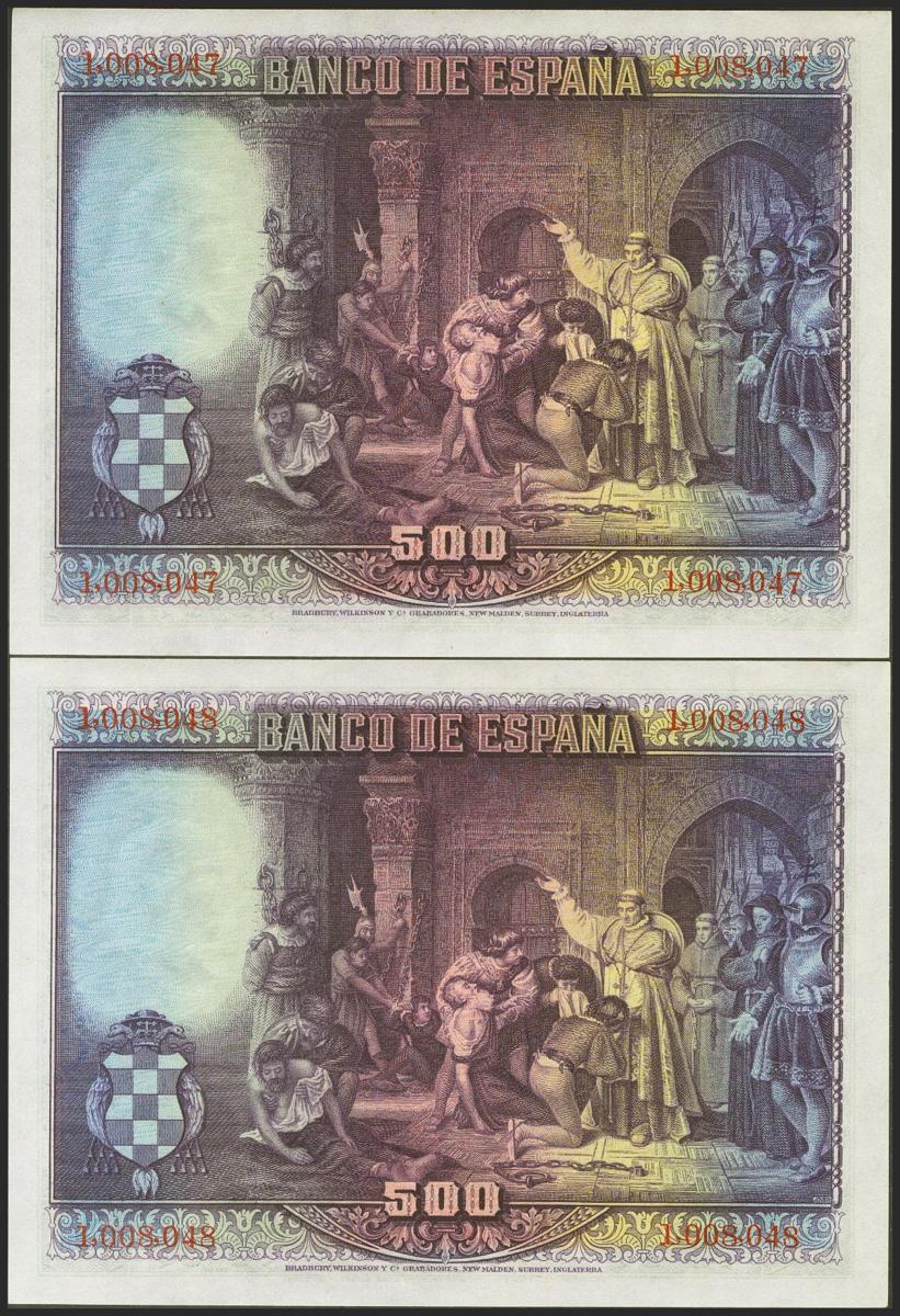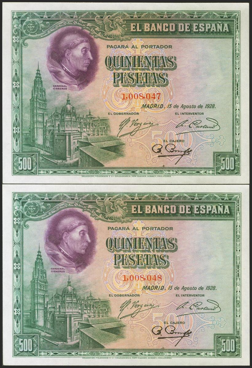 500 pesetas. August 15, 1928. Correlative couple. No serie. (Edifil 2021: 356, Pick: 77a). Rare in this superlative quality, original sizing. Uncirculated.