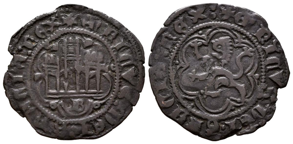 HENRY III (1390-1406). White. (see 1.81g/23mm). Burgos. (FAB-597). Obv: Castle, below B, all within a lobed border with dots on the corners, around legend: ENRICVS REI GRACIA REX. Rev: Rampant lion left inside lobed border with dots on the corners, around legend: ENRICVS REX LEGIONIS ET. Very Fine.