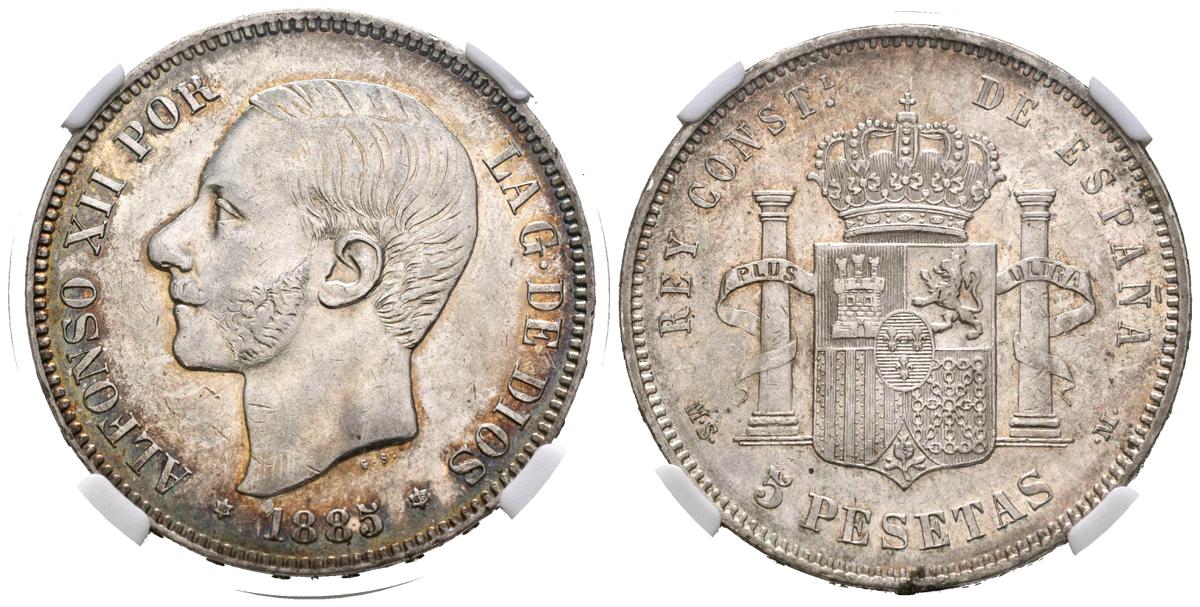 ALFONSO XII (1874-1885). 5 pesetas. (Ar. 25.00g/37mm)*. 1885 *18-85. MadridMSM. (Cal-2019-60). Good Very Fine. *Encapsulated by NN Coins as XF45+.