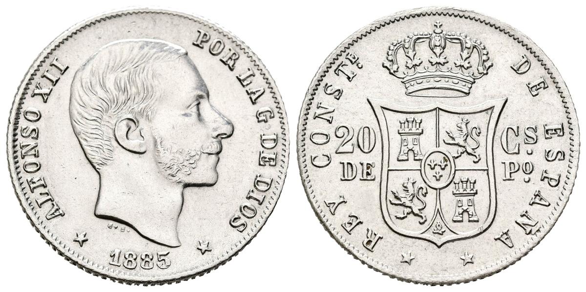 ALFONSO XII (1874-1885). 20 cents. (Ar. 5.17g/23mm). 1885. Manila. (Cal-2019-111). Extremely Fine. polished.