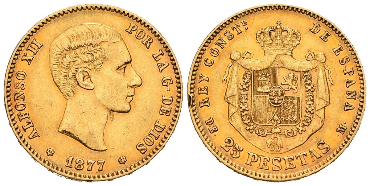 ALFONSO XII (1874-1885). 25 pesetas. (Au. 8.04g/24mm). 1877 *18-77. Madrid DEM. (Cal-2019-68). Good Very Fine.