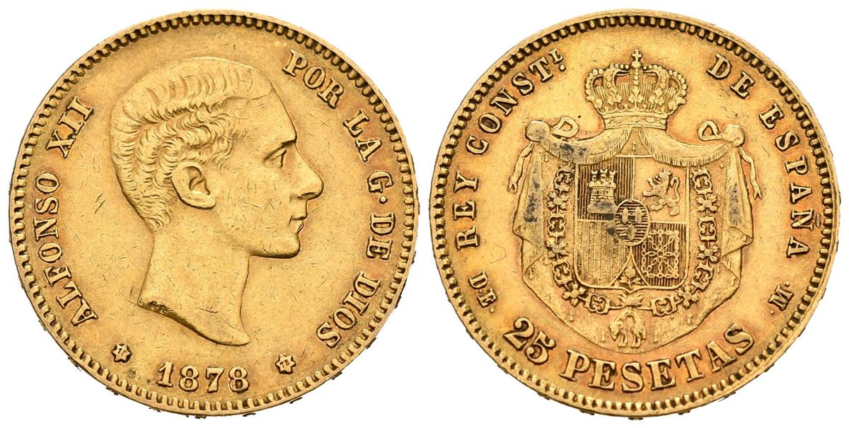 English ALFONSO XII (1874-1885). 25 pesetas. (Au 8.04g/24mm). 1878 *18-78. Madrid DEM. (Cal-2019-70). Good Very Fine.