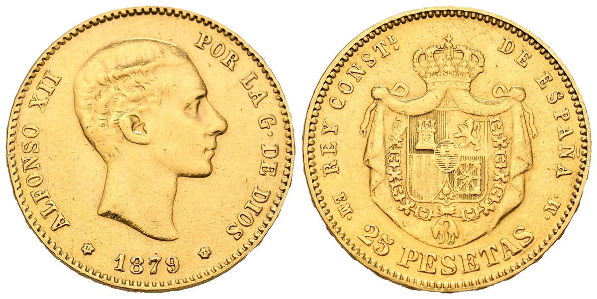 English ALFONSO XII (1874-1885). 25 pesetas. (Au 8.00g/24mm). 1879 *18-79. Madrid EMM. (Cal-2019-74). Very Fine. Worn as jewelry.