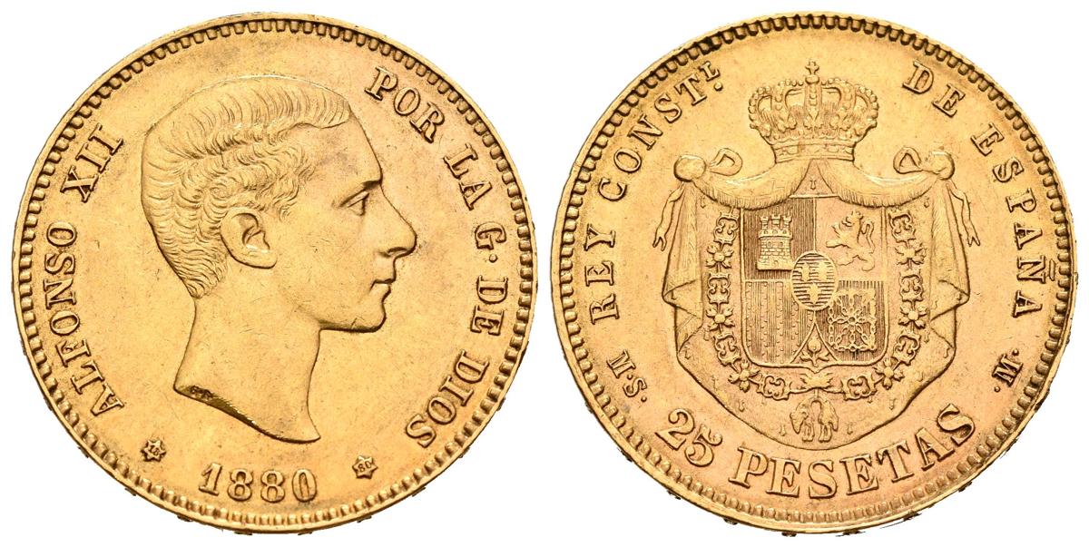 English ALFONSO XII (1874-1885). 25 pesetas. (Aug. 8.05g/24mm). 1880 *18-80. MadridMSM. (Cal-2019-79). Good Very Fine.