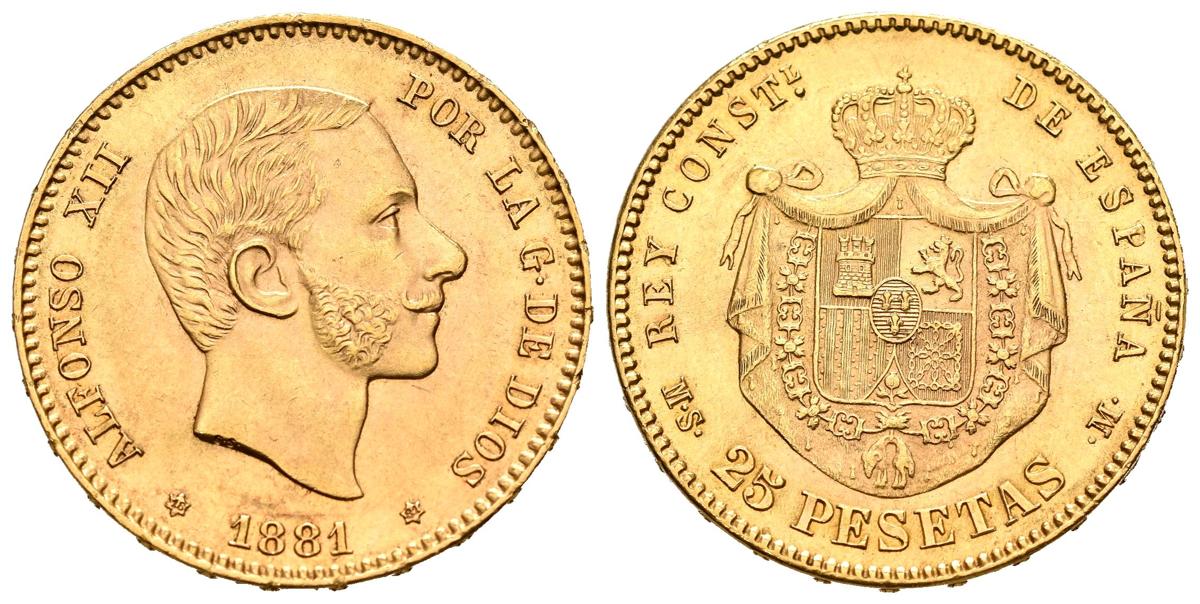 English ALFONSO XII (1874-1885). 25 pesetas. (Aug. 8.05g/24mm). 1881 *18-81. MadridMSM. (Cal-2019-82). Good Extremely Fine. Slight marks.