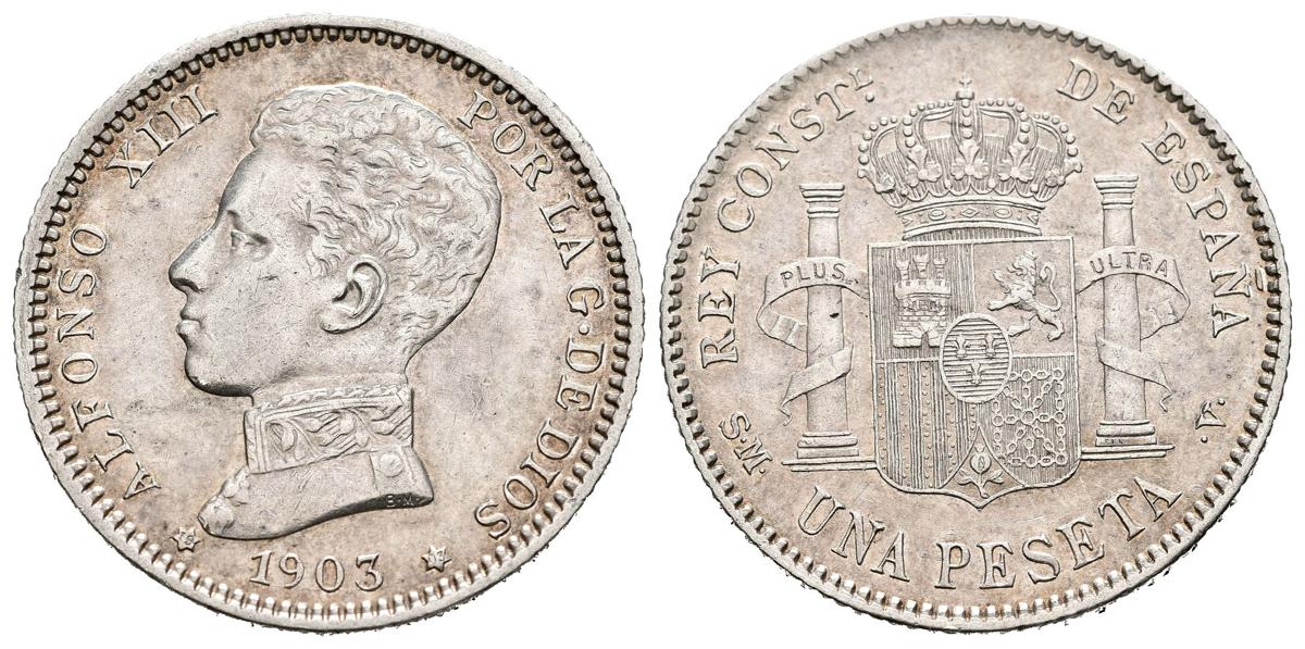 ALFONSO XIII (1885-1931). 1 Peseta. (Ar. 4.98g/23mm). 1903 *19-03. Madrid SMV. (Cal-2019-67). Almost Extremely Fine.