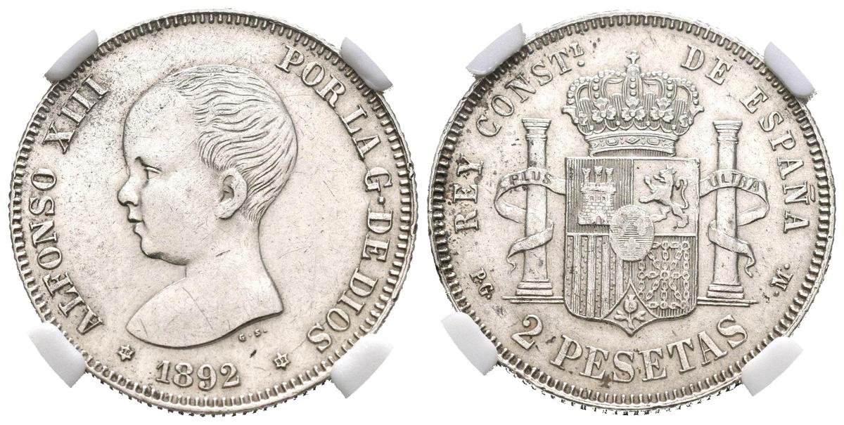 English ALFONSO XIII (1885-1931). 2 pesetas. (Ar. 10.00g/27mm)*. 1892 *18-92. Madrid PGM. (Cal-2019-85). Almost Extremely Fine. cleaned. *Encapsulated by NN Coins as XF45+.