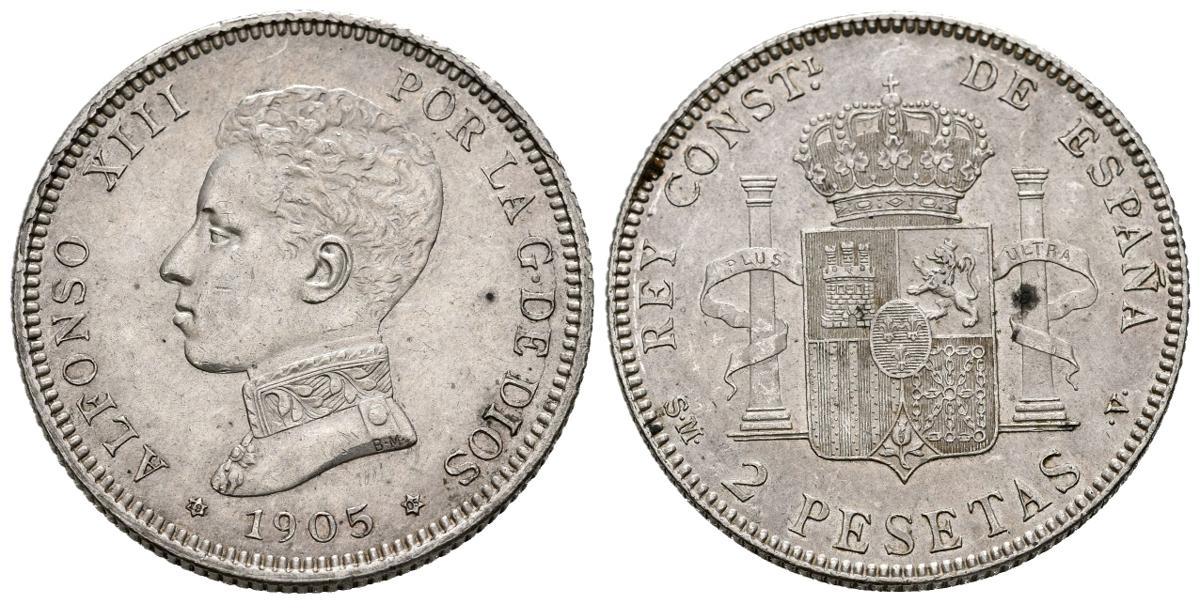 English ALFONSO XIII (1885-1931). 2 pesetas. (Ar. 10.05g/27mm). 1905 *19-05. Madrid SMV. (Cal-2019-88). Almost Extremely Fine