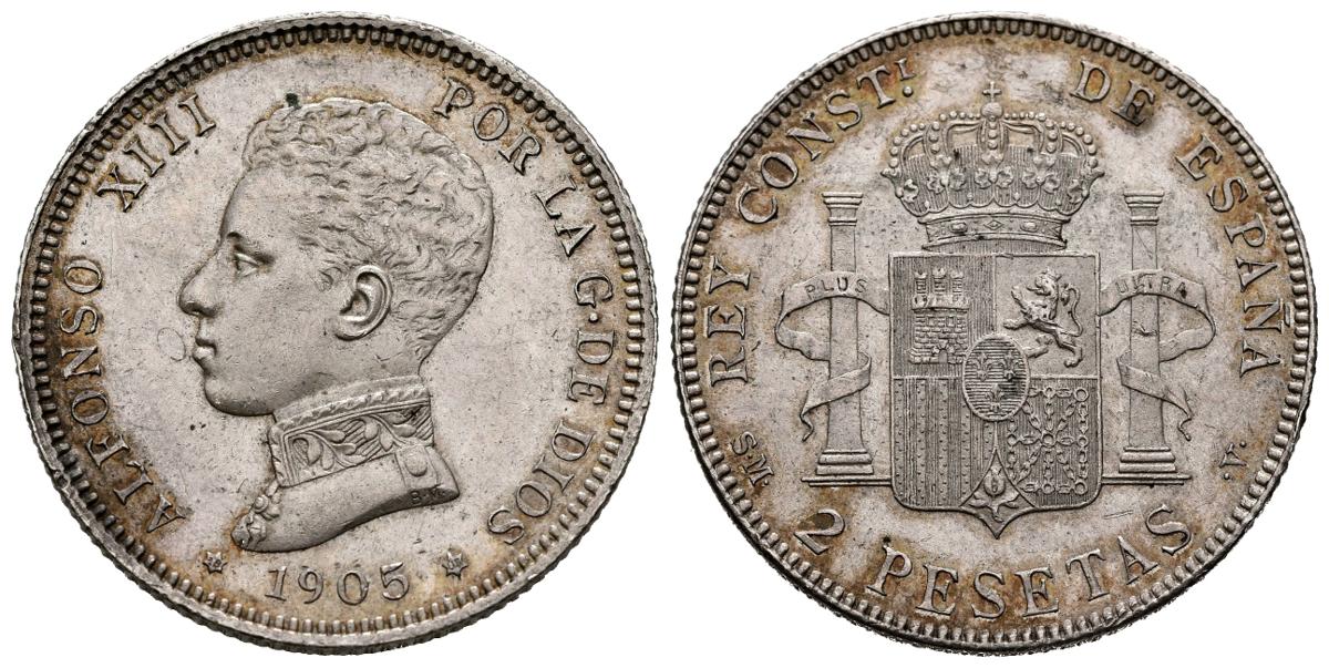 ALFONSO XIII (1885-1931). 2 pesetas. (Ar. 9.97g/27mm). 1905 *19-05. Madrid SMV. (Cal-2019-88). Extremely Fine. Slight marks. Beautiful patina.