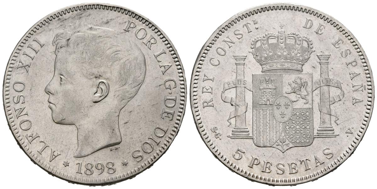 ALFONSO XIII (1885-1931). 5 pesetas. (Ar. 24.93g/37mm). 1898 *18-98. Madrid SGV. (Cal-2019-109). Almost Extremely Fine. Second star partially visible.