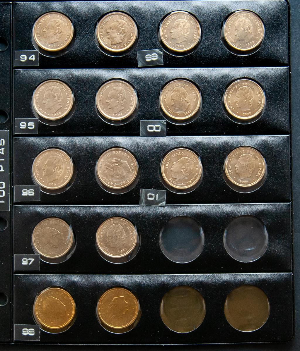 JUAN CARLOS I (1975-2014). Brown sheets composed of 36 coins of 100 Pesetas, minted between 1982 and 2001. High level of conservation in general. TO EXAMINE.