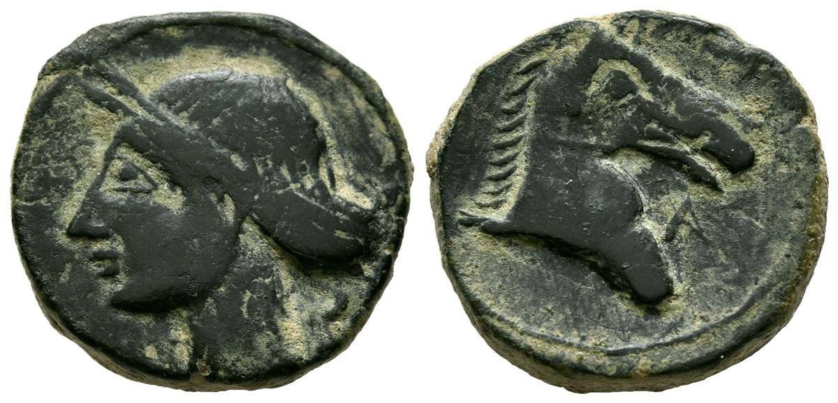 CARTAGONOVA (Cartagena, Murcia). Tracing. (Ae. 8.72g/20mm). 220-215 BC (FAB-511). Obv: diademed head of Tanit left. Rev: Horse's head to right, before letter bet. Very Fine.