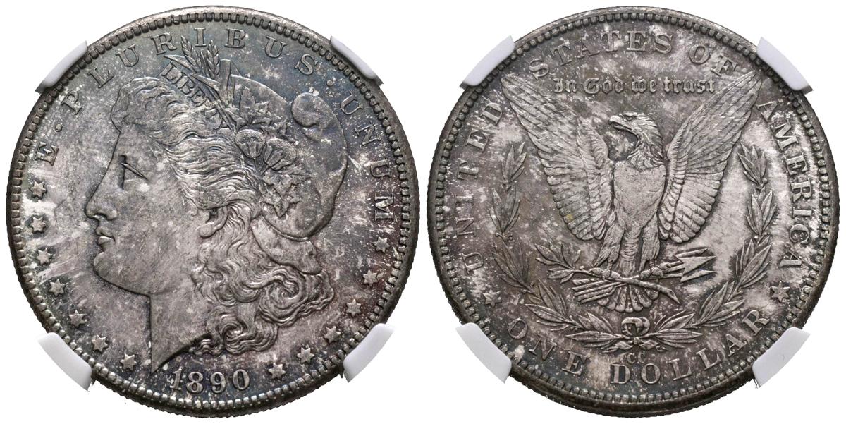 English UNITED STATES. 1 Dollar (Ar. 26.73g/38mm)*. 1890. Carson City CC. (Km#110). Encapsulated by NGC MS64. *Theoretical weight and measure.