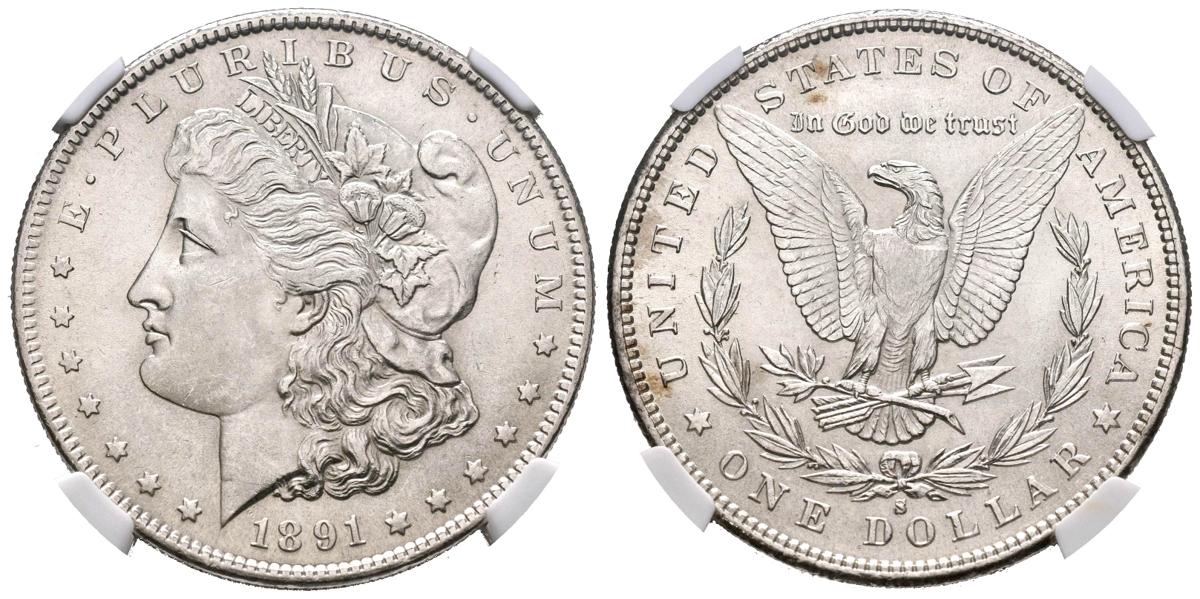 UNITED STATES. 1 Dollar (Ar. 26.73g/38mm)*. 1891. San Francisco S. (Km#110). Encapsulated by NGC MS61. *Theoretical weight and measure.