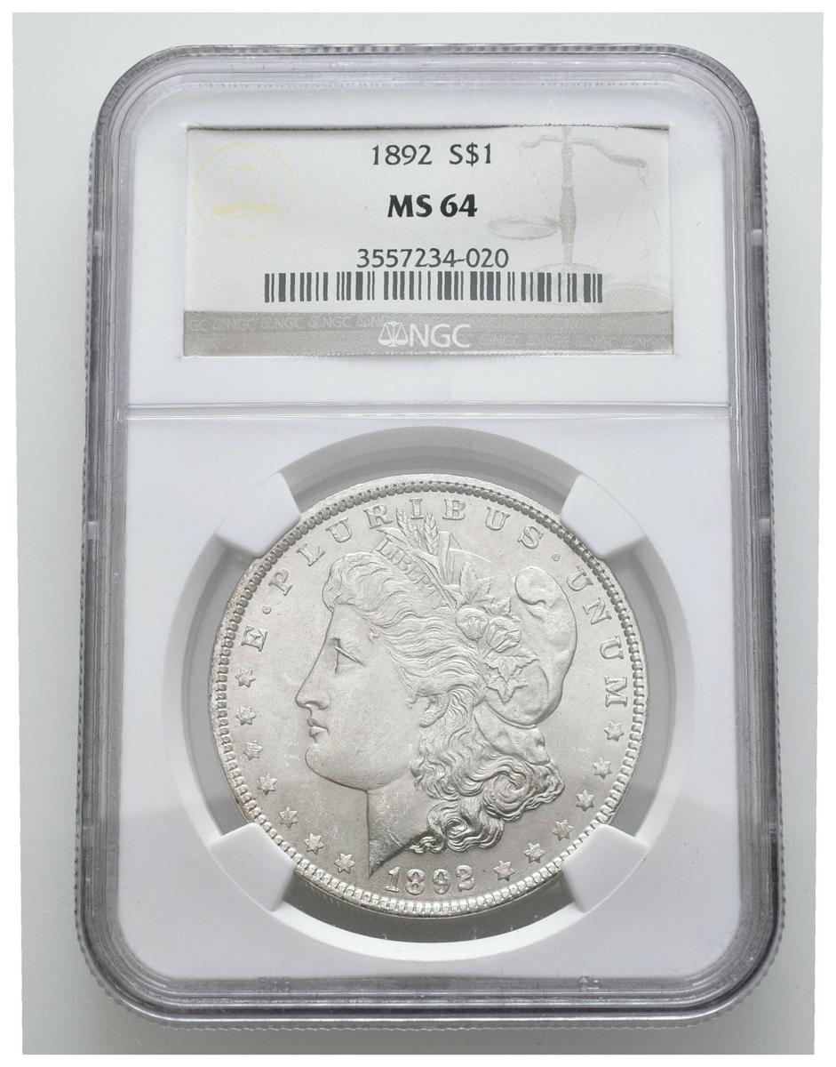 English UNITED STATES. 1 Dollar (Ar. 26.73g/38mm)*. 1892. Philadelphia. (Km#110). Encapsulated by NGC MS64. *Theoretical weight and measure.