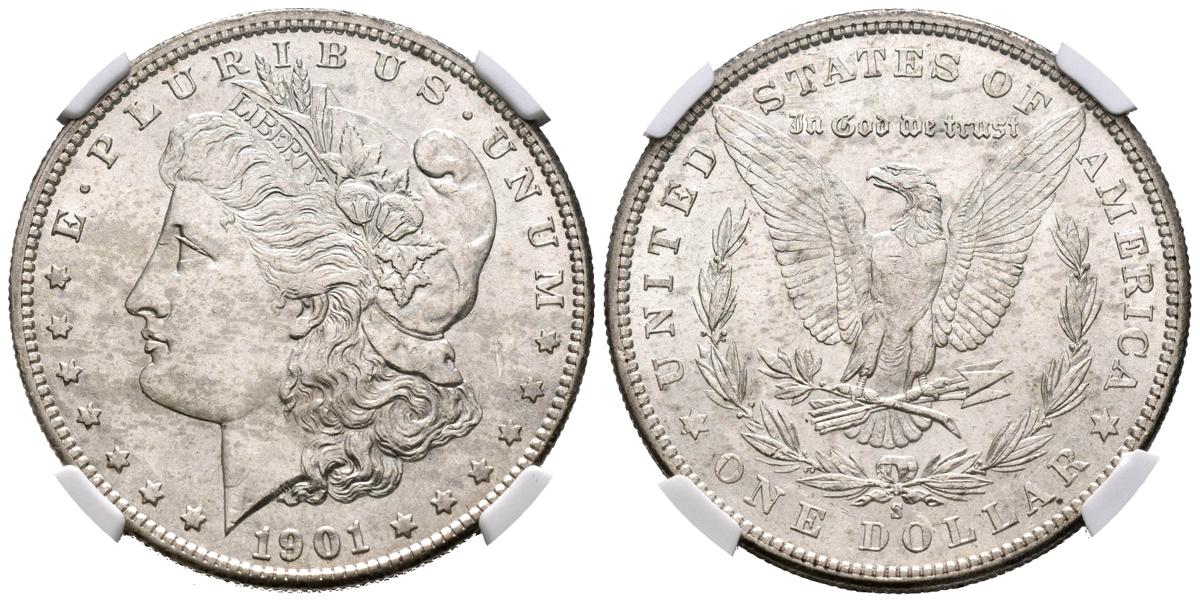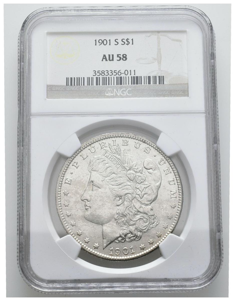 English UNITED STATES. 1 Dollar (Ar. 26.73g/38mm)*. 1901. San Francisco S. (Km#110). Encapsulated by NGC AU58. *Theoretical weight and measure.