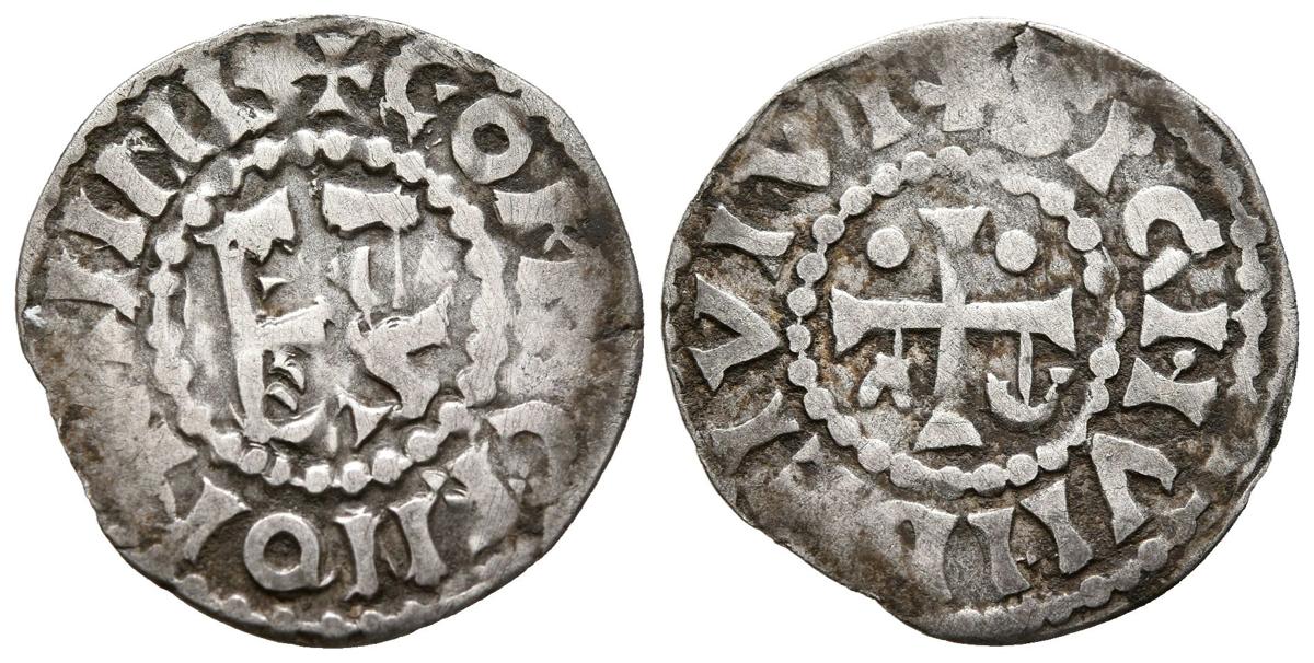 FRANCE, Herbert I. Money. (see 1.01g/20mm). 1015-1035. County of Maine, Le Mans. (Boudeau 170). Obv: Monogram, legend around: COMES CENOMANIS. Rev: Alpha and Omega kick cross in 3rd and 4th quadrant, around legend: SIGNVM DEI VIVI. Very Fine.